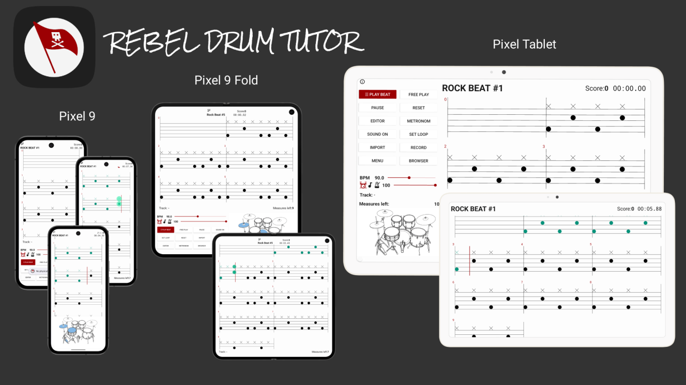 I started learning drums years ago but unfortunately had to quit relative soon due to college and family duties, one being the task of raising three young boys by myself. But the passion never went away and now with the boys grown up I started learning again. But having still no time to take proper classes, I searched for an alternative path, bought some books but had no convenient way to practice with music, to practice the exact notes from the books and hear the beat also nothing giving me feedback the way I needed! But before I again lost all my motivation I thought of making this possible, an application allowing the freedom to practice what I wanted, hearing the music that I wanted and learning the songs I wanted! To learn the drums the rebel way... now possible with the Rebel Drum Tutor App!