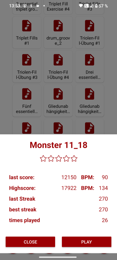 When choosing an exercise a new dialog appears showing a basic overview if already practiced, highscore, last score at which BPM, the amount of stars and best and last streak.