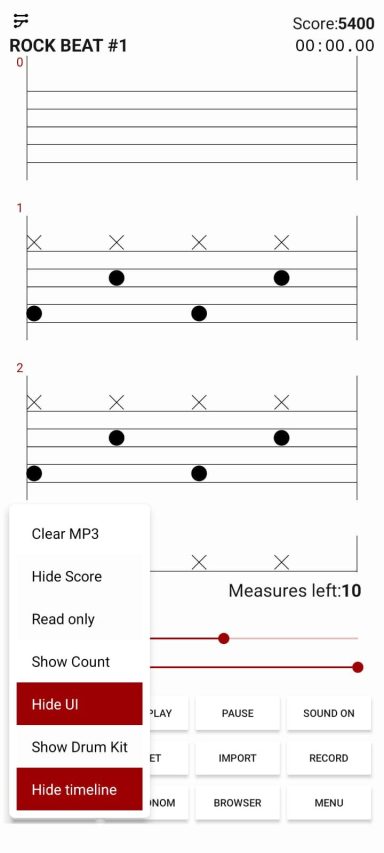 When playing the User Interface will hide showing a full view of the note sheet. This can be toggled by accessing the play menu - long click on 'Play Beat'