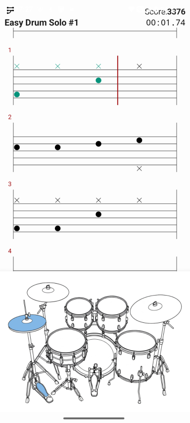 The application can read and interpret MIDI signals coming from the E Drum. Hit the drums at the right time and the note will turn green!