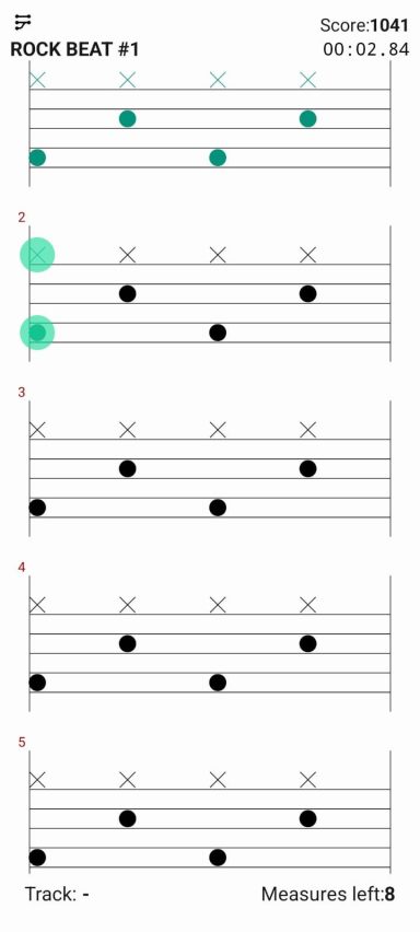 Also clicking on the instruments will trigger the sound and when playing and in snyc with the notes they will also show a hit effect. This allows to practice timing and rhythm even without a drum kit. Just using the fingers.