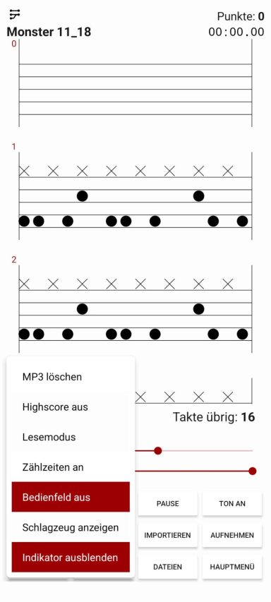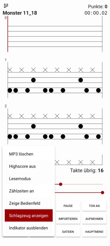 Durch langes Drücken der Abspieltaste gelangt man in ein kleines Menü. Dort kann man die Option „Schlagzeug anzeigen“ auswählen, woraufhin ein Schlagzeug erscheint, sobald man zu spielen beginnt. Am Schlagzeug werden die kommenden Noten farblich hervorgehoben und angezeigt. Setzt man das Tempo (BPM) herunter, kann man besser verfolgen, welche Noten gespielt werden, und so effektiver Schlagzeug lernen.