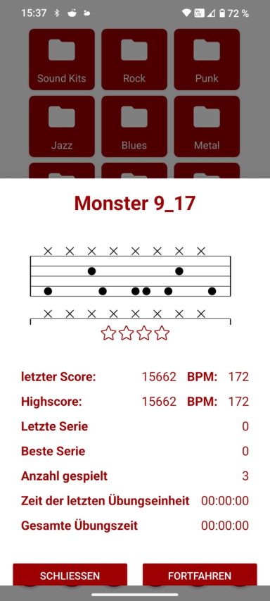 Wählt man eine Übung aus dem Verzeichnis aus, erscheint ein Fenster mit Statistiken zur Übung, darunter Highscore, letzte Punktzahl, verwendetes Tempo, beste und letzte Serie sowie die Sternanzahl.