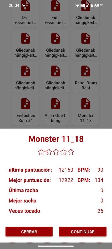 Al seleccionar un ejercicio, aparece un nuevo cuadro de diálogo que muestra una vista general básica: si ya ha sido practicado, la puntuación más alta, la última puntuación con su BPM, la cantidad de estrellas y la mejor y la última racha.