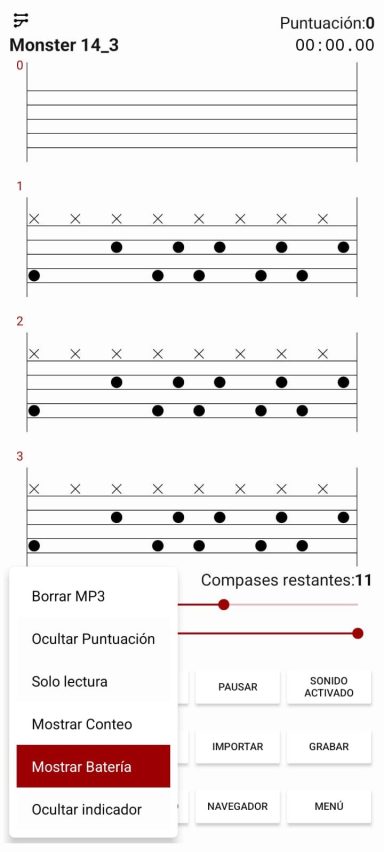 Durante la reproducción, la batería se muestra y resalta las próximas notas. Al reducir el valor de BPM, es más fácil seguir y tocar las notas correctas. Especialmente para principiantes, esta es una forma muy eficaz de aprender y familiarizarse con la batería.