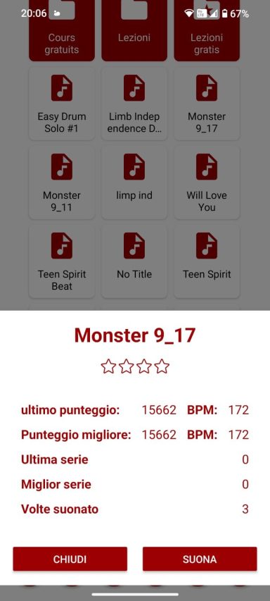 Selezionando un esercizio, appare una nuova finestra di dialogo che mostra una panoramica di base: se è già stato praticato, il punteggio massimo, l’ultimo punteggio con il relativo BPM, il numero di stelle e la migliore e l’ultima serie.